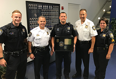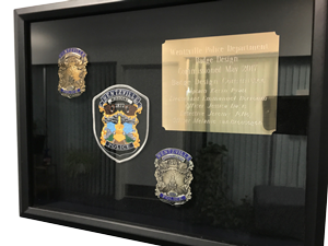 Chief Kurt Frisz (second on left) with support staff posing with a shadow box containing their new badge and patch see below a blow up of the shadow box.