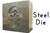 A steel block with a reverse relief of your badge, seal, panel, or custom insignia item; which is then used to stamp the product out of metal.